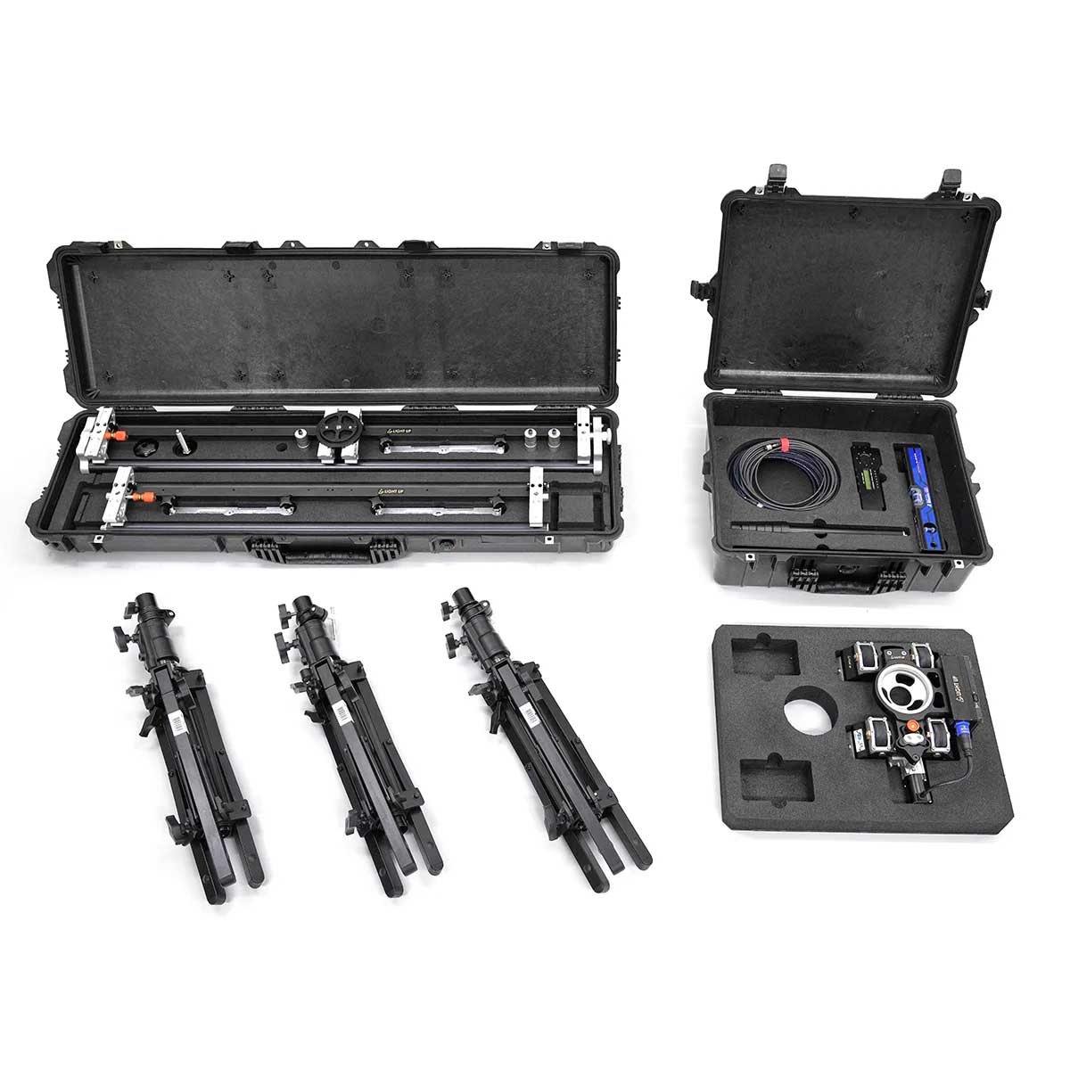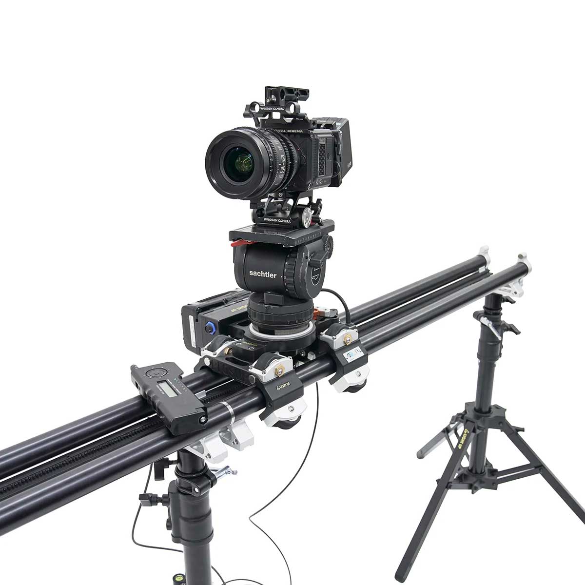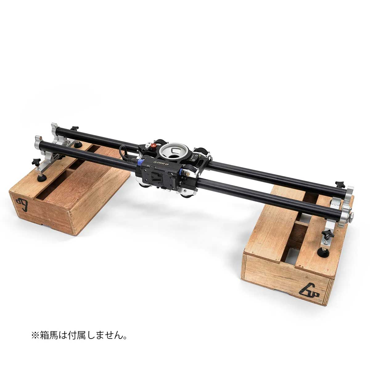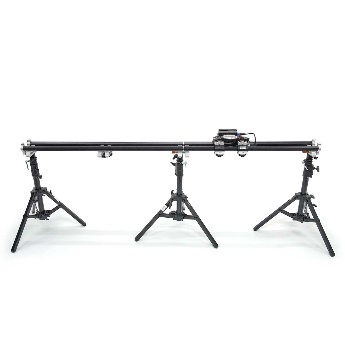 三脚ヘッドのボールマウントは100mm のみ対応で、専用レールは100cm と120cm のものを付属させ、弊社ではオプション(Prosup TANGO Truck (1m+1.2m))でもう1本ずつ延長することが可能です。床面での運用や、オプション対応の三脚、スライダースタンドでの設置に対応します。