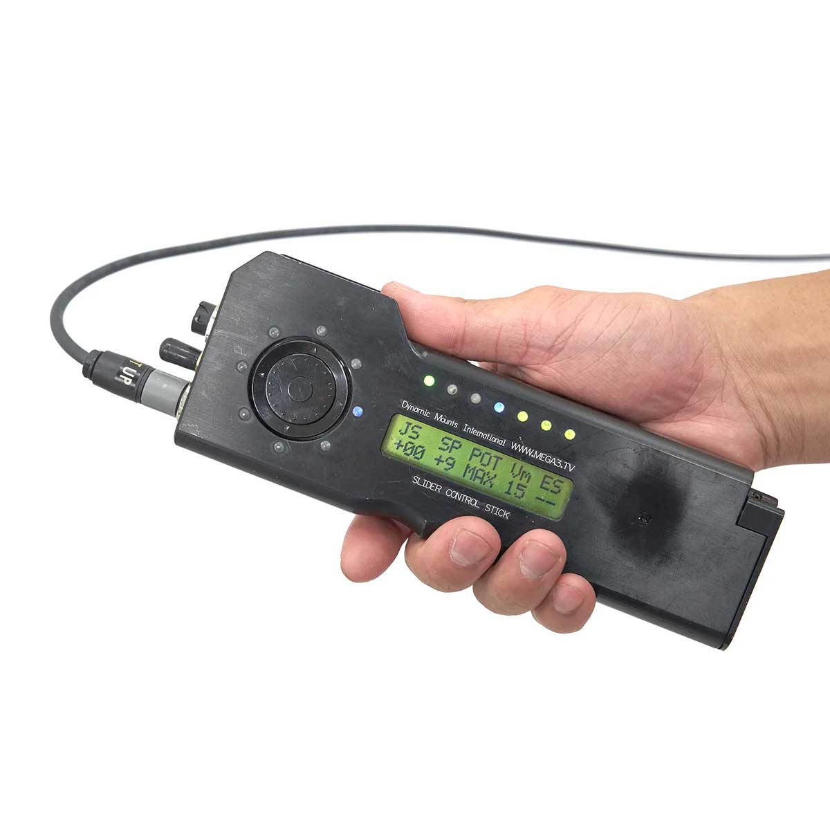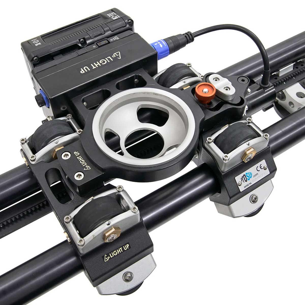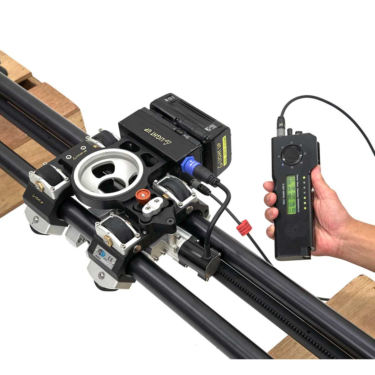 スライダー 本体に取り付けてあるモーターユニットを有線コントローラーにて操作、エンドストップの調整や速度、位置などをプログラムすることができます。電源は V-mountバッテリーで、手動操作への切り替えもでき、電動でも手動でも非常に滑らかな動きをします。