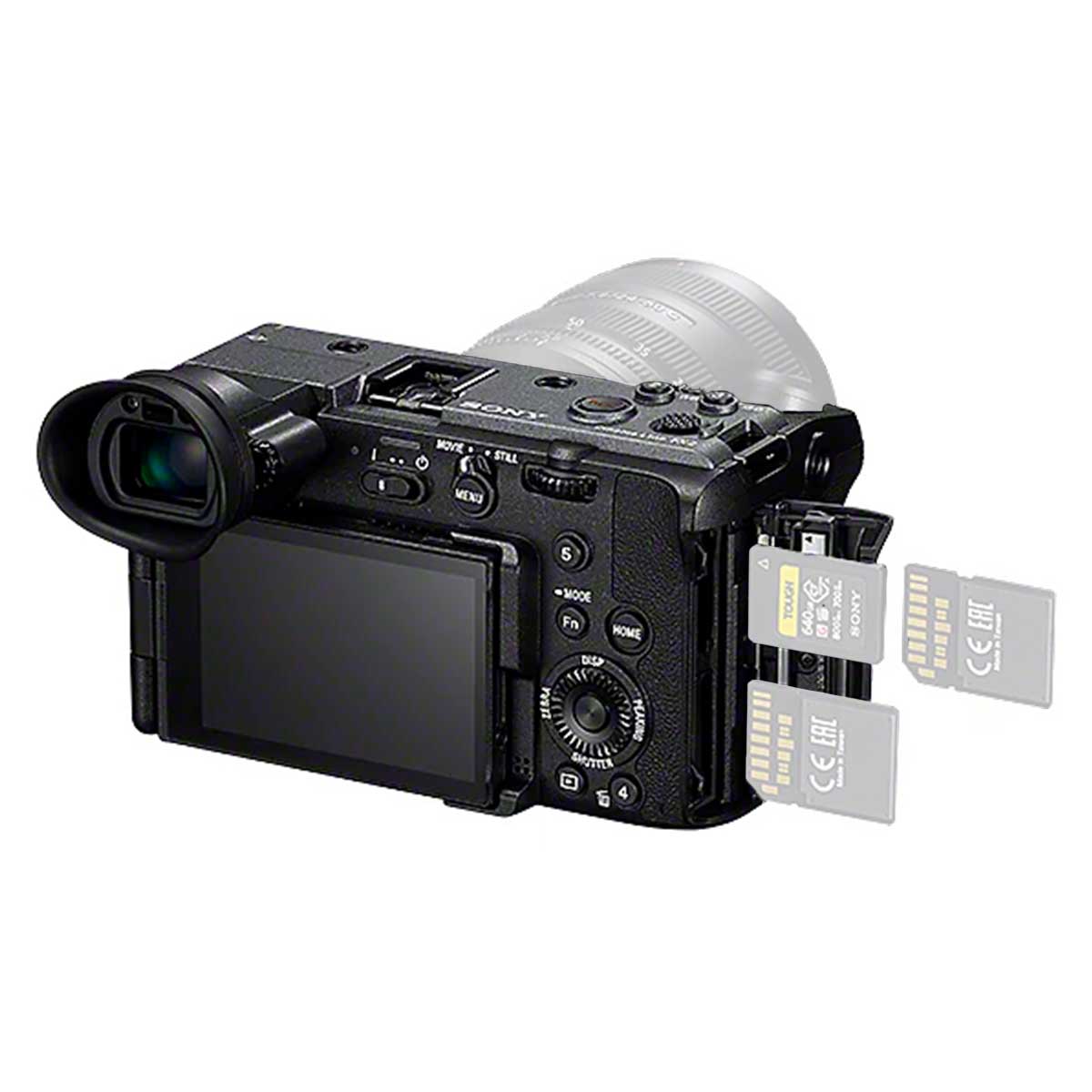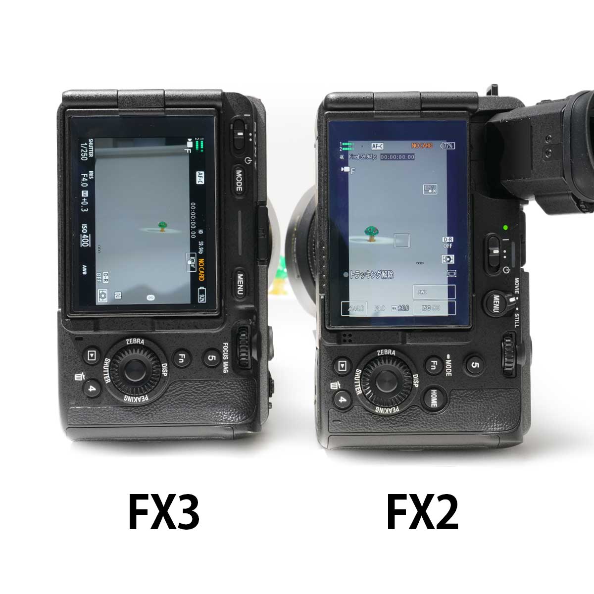 SONY FX2は、ボディ形状や機能はほぼSONY FX3を踏襲しながら、静止画時は有効約3300万画素、動画時は約2760万画素のフルサイズセンサーとなり、ボディ左端に角度可変(上方向に90度)のEVFが新たに設けられたのが外面上の大きな特徴となっています。これにより、MOVIE / STILLの切り替えスイッチも新たに追加され、モード切り替えが容易にできるようになりました。 その他、冷却ファンの改善や、液晶ホーム画面に SONY FX6やSONY VENICE 2で採用されてる”BIG6”表示がされるようになっています。