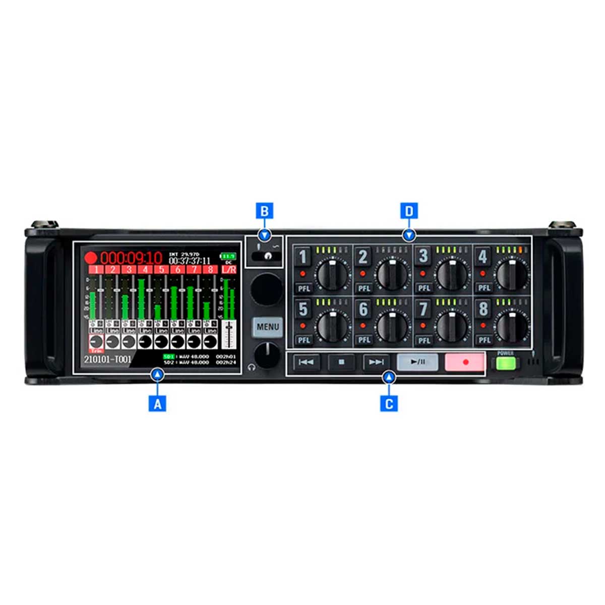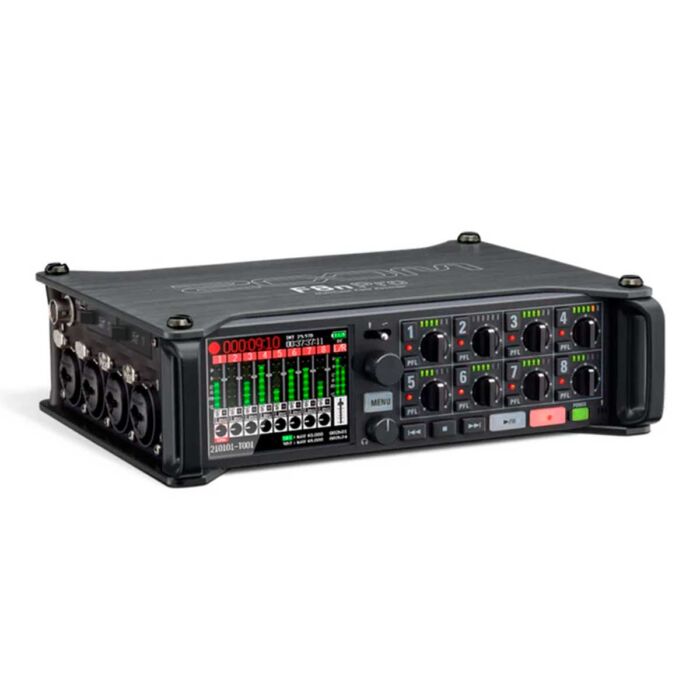 ZOOM F8n Proは、8つのXLR入力を備え、最大10トラック(8入力+L/R)のWAV形式192kHz、32bitでの同時録音が可能。